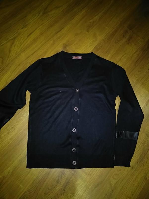 Хорошая альтернатива жакету, тонкий приятный трикотаж, на рукавах нажиты полоски из экокожи.Длина 52, плечи 38, рукав 55, ПОГ 46. Под рукавом зашивалось