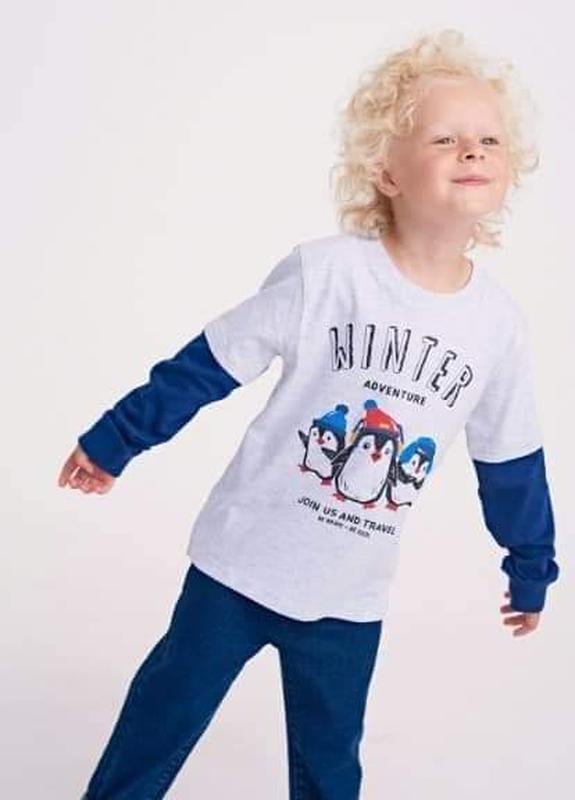 🔥Светло-серый демисезонный повседневный лонгслив с рисунком.👉Трикотажный лонгслив с имитацией футболки. ☝️Прямой крой, круглый вырез горловины, длинный рукав. Перед декорирован ярким принтом.. 💜Состав: 98% хлопок, 2% полиэстер. ✅Размер : . 4 го да ( 104 см)
