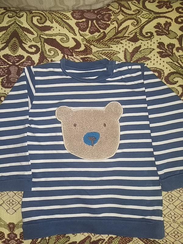 продам кофточку для мальчика на возраст по бирке 1-1,5 года,с переди по горловине не большая желтизна, под мордашкой медведя тоже маленькие пятнышки. замеры- длина рукава-28, длина кофти-35, ширина между проймами-30, ширина плеча-6,5( безобтачки по горловине)