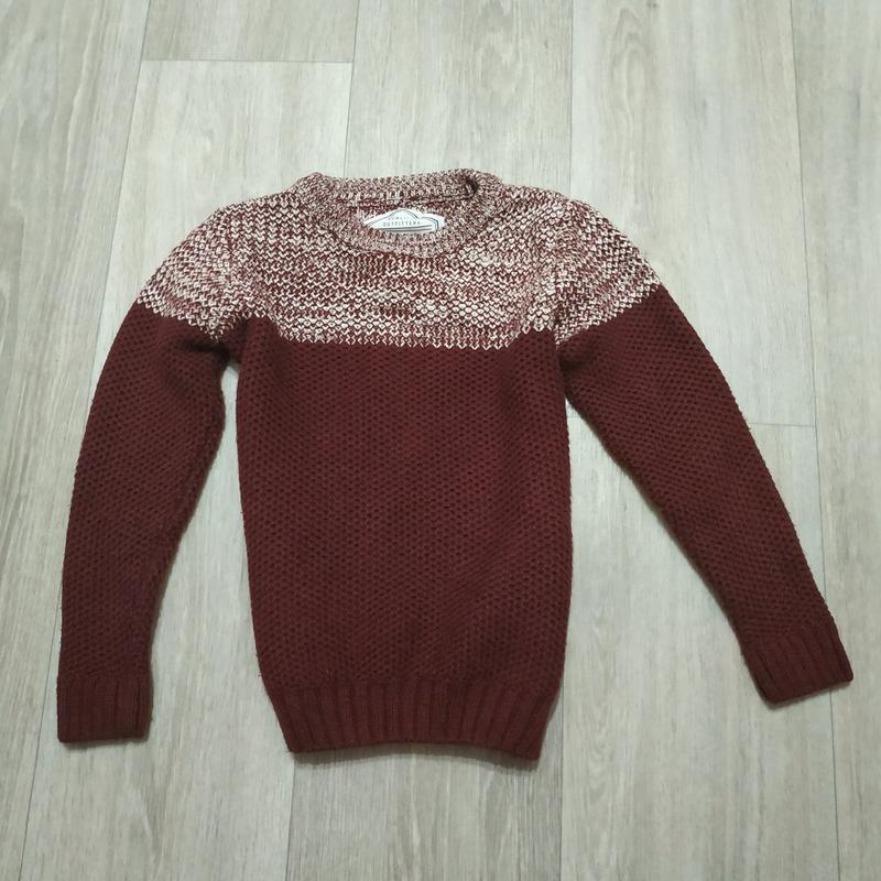крутий світер на хлопчика бордового кольору, від горловини до грудей в'язка з білою ниткою.