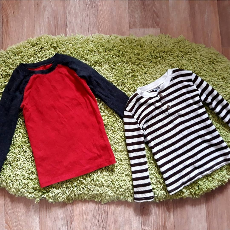 На 3-5 років. Заміри Червоний Довжина 45 Ширина 32 Рукав від горловини 47 Смугастий Довжина 43 Ширина 32 Рукав від плеча 34 Плечі 32 Стан відмінний. Ціна за два.