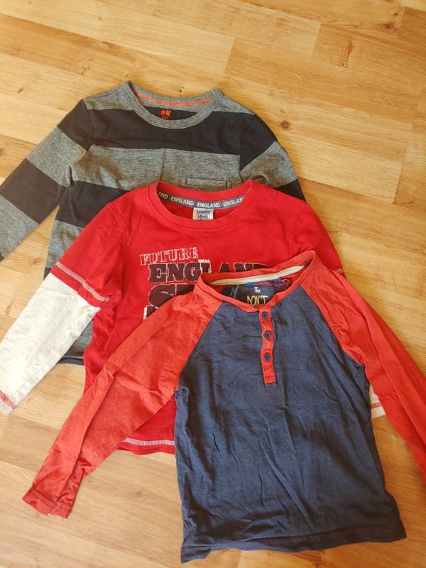 Лонгсливы на хлопчика. Все можна носити від 2-3лет і до 4-5. Дивіться по дитині. Верхній hm на 4-6(110/116) але буде від 3х до 5 років. Рукав 36см Середній george на 2-3 рочки(92-98) Рукав 33см Нижній Tu на 4-5(104-110) Рукав 41см від шийки. Продаю набором 200грн за все.Стан ідеальний.