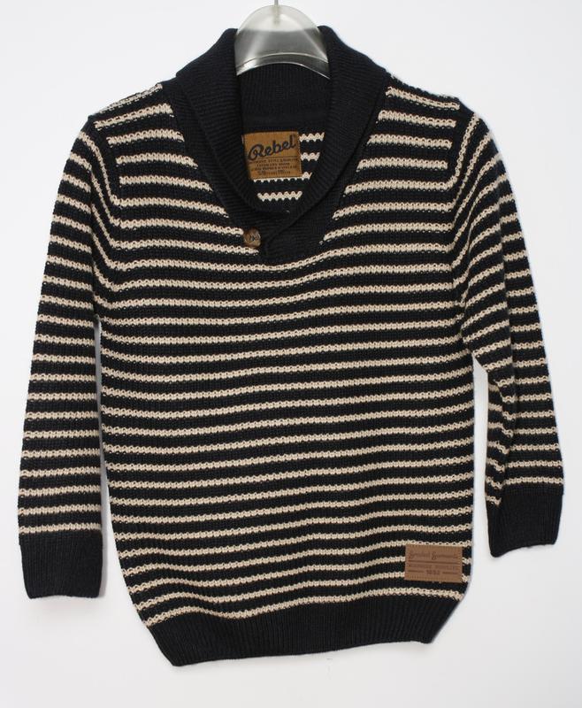 Свитер на мальчика Модный свитер для мальчика в полоску. Воротник ― "шалька" на пуговице Украшен кожаной нашивкой. Цвет: как на фото Состав: 100% акрил размер: 116-122