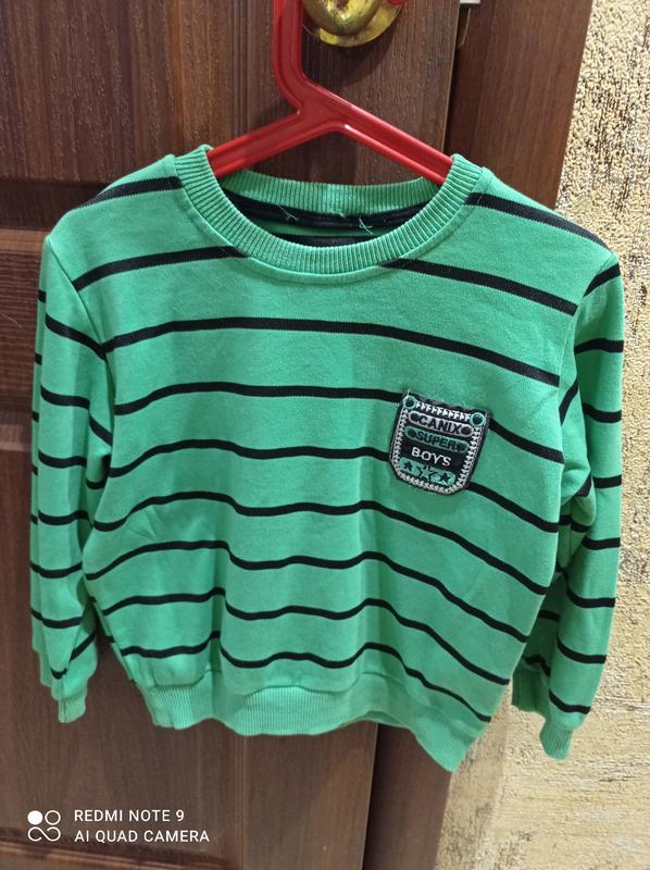 кофта на мальчика в хорошем состоянии. на фото видно,что немного испачкана ручкой(еле видно). цвет- ярко-зеленый.