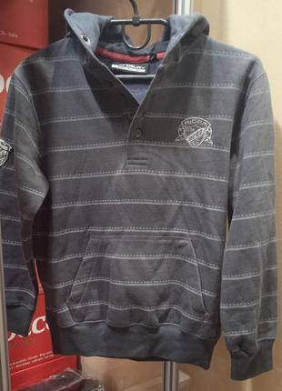 Серая кофта в полоску с капюшоном, спереди на четвах пуговицах. Кенгурушеные карманы. Размер 128см.
