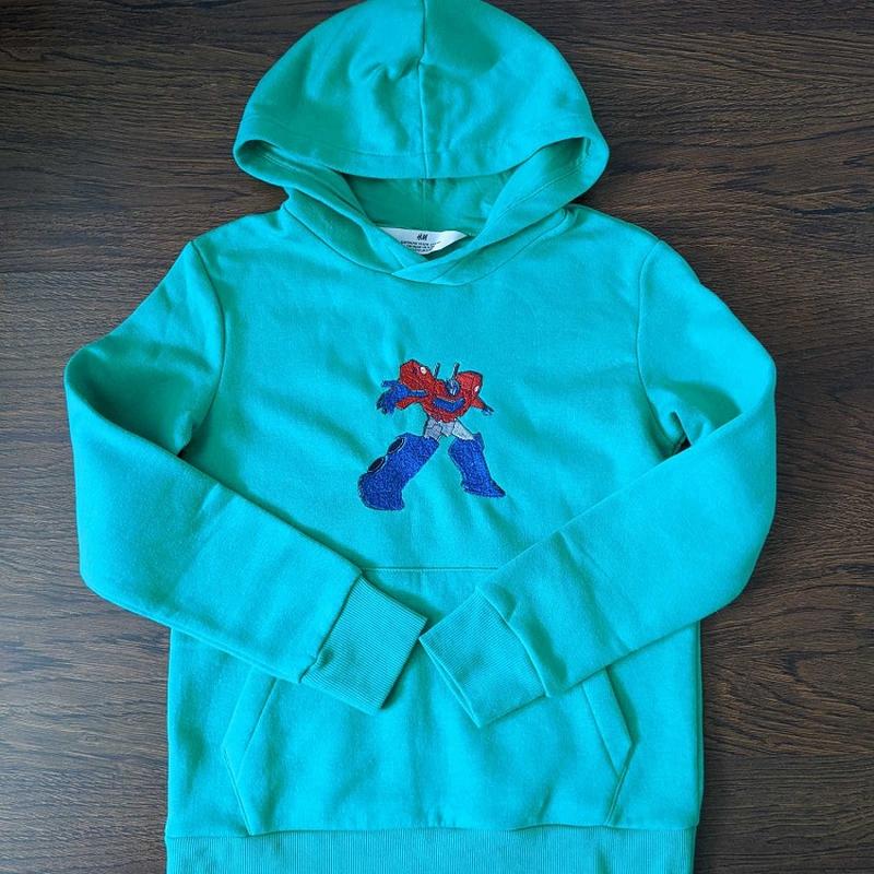 Вишите худі H&M для хлопчика Оптімус (Optimus Prime). Вказаний розмір 134-140 см, але орієнтуйтесь на заміри: ширина по грудях 42 см, довжина 51 см, рукав 52 см.