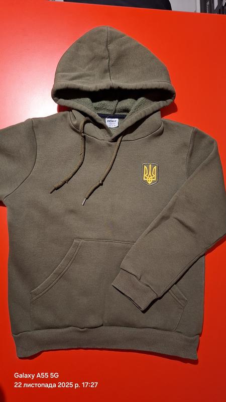 Продаю патриотическое и очень теплое худи (кофту с капюшоном) в цвете хаки/масла. Это стильная и актуальная одежда для ребенка, которая подчеркивает национальную идентичность. Худи утепленное байкой/начесом изнутри, что делает его идеальным для осени и зимы! ✨ Характеристики и преимущества: Тип одежды: Худи (кофта с капюшоном и карманом-кенгуру). Утепление: На байке (с начесом). Дизайн: Вышитый/нашитый золотистый Тризуб (Герб Украины) на груди. Цвет: Хаки (Олива/Military). Фасон: Классический, с манжетами, капюшон на шнурках. Карман: Большой карман "кенгуру" спереди. 📏 Точные замеры (ориентировочно 8-10 лет): Пожалуйста, ориентируйтесь на замеры! Длина от горловины (по спине): 52 см Ширина (подмышками): 45 см Длина рукава (от плеча): 47 см Ориентировочный рост: 128–140 см.