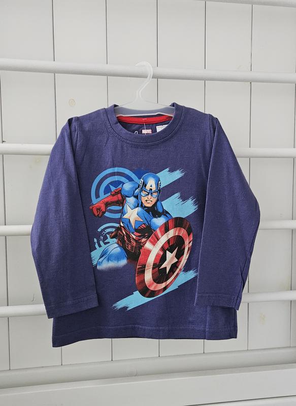 Реглан Primark с Капитаном Америка. Размер 2-3, 98. Имеется нюанс- осветленная пятнышка, отобразили на фото. В цене учитывала. Новый. Длина - 39 см, плечи - 22 см, рукав от плеча - 33,5 см, ПОГ - 32 см.