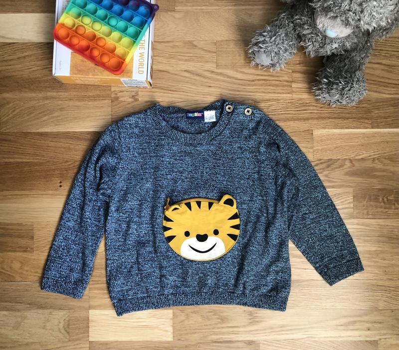 Состояние очень хорошее. Функциональные пуговицы для удобства одевания. Кармашек с мордочкой тигра. По бирке рост 86/92, возраст 12-24 месяца. Бренд: Lupilu Материал: 100% Коттон Длина 34 см. Ширина в середине кофты 33 см. Длина рукава от горловины 38 см.