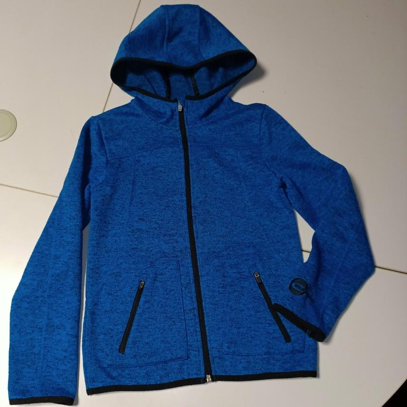 Кофта качественная с капюшоном на молнии. Имеет насыщенный синий цвет, комбинированная черными кантиками по краям. Длина кофты 53см, длина рукава 52см, плечи 35см, НоГ 39см.