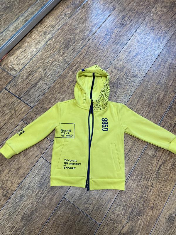 Яркая стильная тёплая трикотажная кофточка для мальчика 3-4 лет. Трикотаж плотный, с изнаночной стороны с искусственным мехом с невысоким ворсом. Все швы, ниточки, аппликации целы, замок рабочий. На манжетах и резинке по низу изделия есть небольшие катышки. Цвет не вылинял и не потерял яркость - ярко лимонный с темно синими элементами.