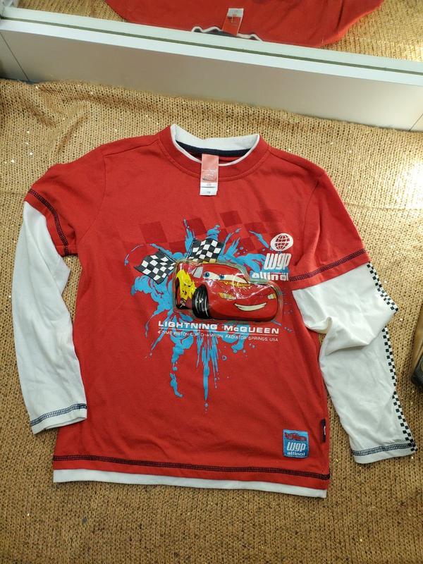 Пуловер для мальчика, б/у, состав ткани: 65%- полиэстер, 35% коттон, 1на рост 128 см. От бренда Disney. Плечи- 34см, ПОГ- 40 см, ПОТ- 38 см, полуобхват низа- 39 см, длина рукава- 47,5 см, длина изделия- 49 см. Объемная силиконовые нашивки с автомобилем длина- 16,5 см, высота- 10 см.