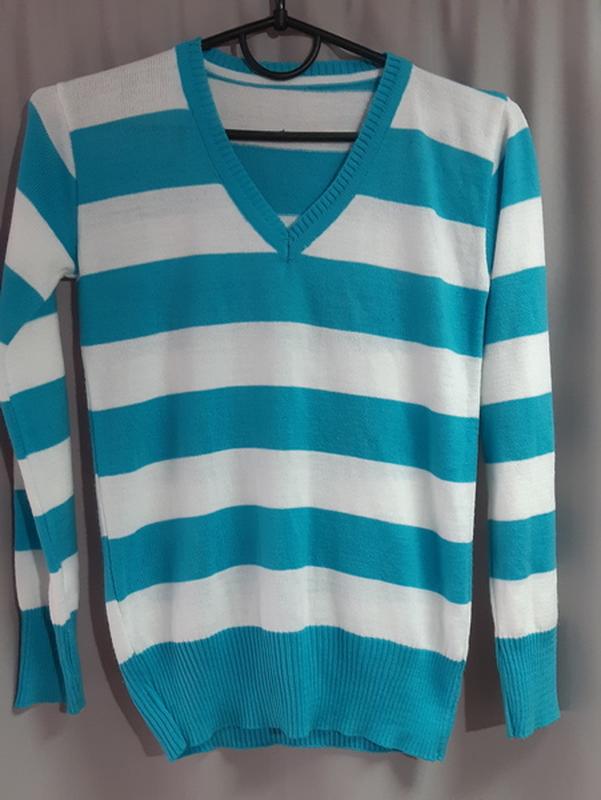 Кофта детская на мальчика Columbus. На рост р158. ПОГ-41, Плечи-37, Рукав-65, Длина-63. Цвет белый/бирюза, полоска. Columbus