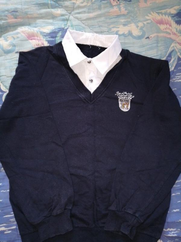 Трикотажная темно синяя кофточка с белым воротничком, типа рубашка. Рукава и низ кофты на манжете. Не новая, состояние очень хорошее. Замеры : длина изделия по спинке от шеи 55 см, плечи 41 см, полуобхват груди 46 см, низ до манжета 37.5 см, манжет 34.5 см, длина рукава 51 см, внутренний шов 41.5 см.