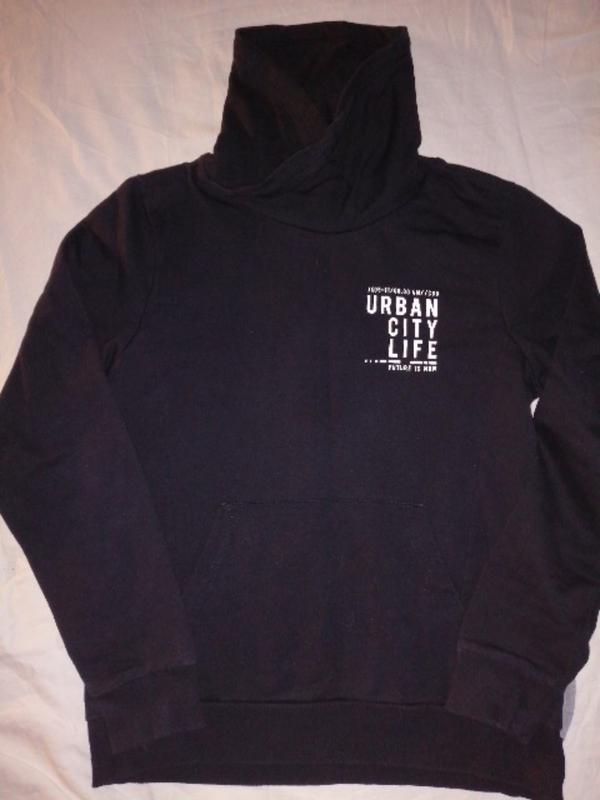 Черная спереди и серая сзади трикотажная кофточка. Кенгурушко. Низ и рукав кофты на манжете. Горловина высокая, не держащая стойку. Не нова, состояние идеал. Измерения: длина изделия по спинке от шеи 58 см, плечи 36.5 см, полуобхват груди 45 см, низ до манжета 44 см, тянущаяся к манжету 43.5 см.