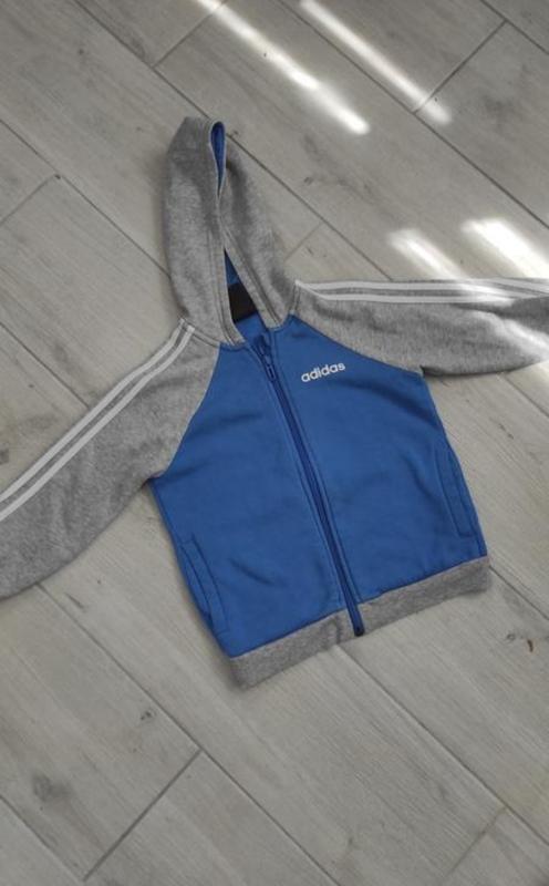 Классная спортивная кофта на мальчика 2-4роков, на последнем фото небольшой дефект (ансивно можно вывести ванишом). Есть карманчики и капюшон Ширина - 34 Рукав от гордостей- 32 Длина - 42