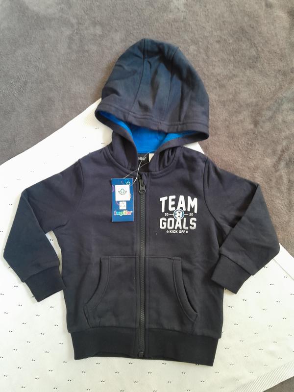 Кофта спортивная с начесом для мальчика Lupilu. Рукава и низ с эластичными ребристыми манжетами. Есть карманы и капюшон, застежка-молния. На грудях принт. Ткань хорошего качества, не теряет цвет и форму после длительного использования Размер: 86/92см