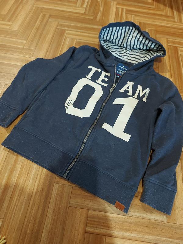 Толстовка детская от TOM TAILOR с надписью, капюшон с полоскатым подкладом, два боковых кармана, застегивается на молнию, на рукавах манжеты, без пятен и дефектов, замерами заглядите