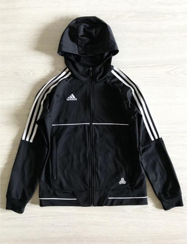 Спорткофта Adidas (оригінал) з кишенями. Розмір з бірки 11-12 років. Фото на моделі з розміром S (жінка, зріст 160 см). Довжина 57 см. ПОГ 45 см. Рукав від капюшона 65,5 см, з під пахви 46 см. Поліестер. Стан б/у, відмінний, сток.