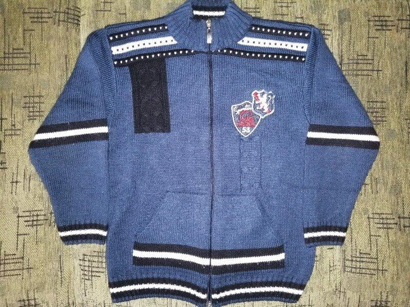 Кофта синяя плотной вязки. На замке. 100% акрил. Турция. Есть карманы. Размер 116-128. Замеры: длина - 48 см, ПОГ- 40 см, рукав - 39 см, плечи - 37 см. Без пятен, дыр, есть скатыши.