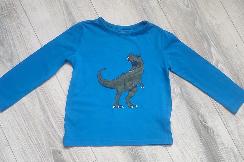 Лонгслів синього кольору з переді малюнок динозавра. Розмір 98,вік 2-3 роки. Стан ідеальний. Заміри: пог 32 см; рукав 35 см; довжина виробу 38 см.
