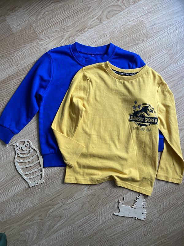 Лонгслів з динозавром на 4-5 років. Стан сток, не ношений, без бумажної бірки. Колір в реальності трохи яскравіший ніж на фото. 📌Заміри: Довжина від плеча 44,5 см ПОГ 34,5 см Довжина рукава від плеча 37,5 см На такий розмір є ще сірий лонгслів.