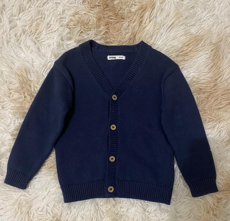 Кардиган темно-синего цвета в размере 98. Замеры: Длина - 37, рукав - 30,ног - 30