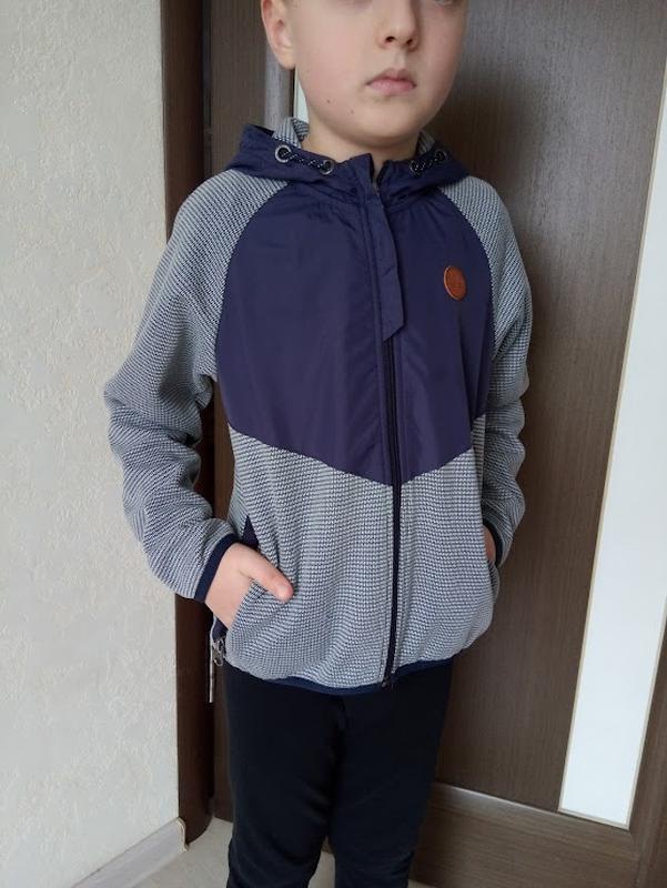 Классная и удобная трикотажная олимпийка на замке. С вставками из плащёвки. Капишон тоже из плащевки с подкладкой. Подойдет на размер 122-134.