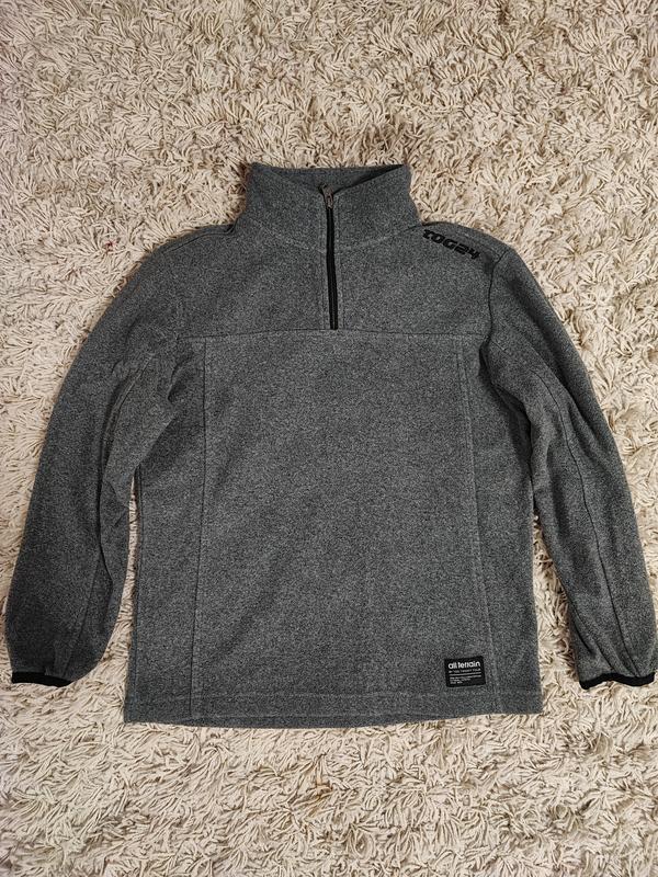 Темно серая флисовая кофта. Tog24 Размер указан на 9-10 лет, а по факту идет до 130 см. Кофта очень теплая, с невысокой горловиной, на застежке. 100% полиэстер. Длина по спине 52 см. Рукав 46 см. Ширина 41 см.