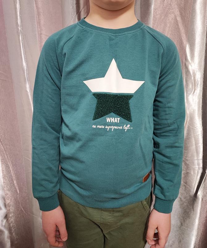 Свет зеленая кофта / реглан. Принт - звезда. Манжети на рукавах. Теплая и приятная к телу. Размер 128 см (на фото модель 134 см). 65% котон, 30 % поліестер, 5 % еластан. Ширина 37 см. Длина по спине 47 см + 5 см нижний манжет (разом 52 см). Рукав 56 см (от воротничка).