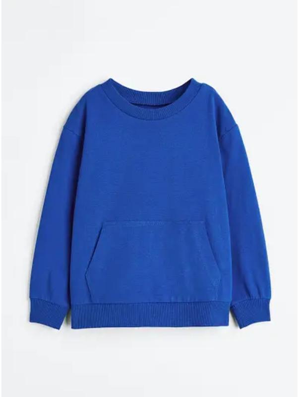 Кофта з довгими рукавами з бавовняного трикотажу, заниженою лінією плечей, кишенею-кенгуру та трикотажною гумкою по горловині, манжетах та нижньому краю. Виробник H&M. Колір - синій. Тканина – 97% бавовна, 3% еластан. Ціна вказана за 1 кофту. В наявності розмір на зріст 92см.