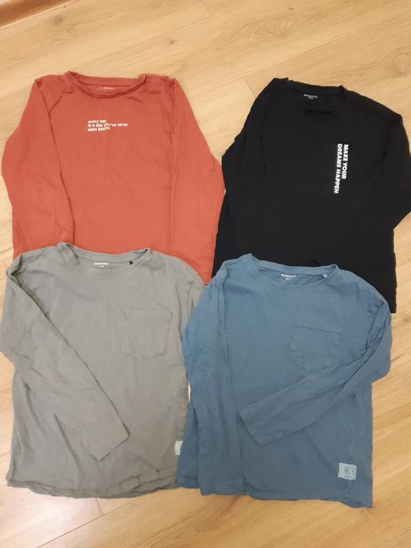 Лонгсліви на зріст 152. Верхній лонгслів теракотовий - випраний лежав у шафі, але не ношений - ціна 100грн. Верхній чорний - ношений раз і випраний, бо виявився вже малим - 100грн. Нижній сірий і блакитний ношені часто, але без плям і дірочок, ціна по 50грн за кожний. Якщо берете всі разом, то ціна 250грн