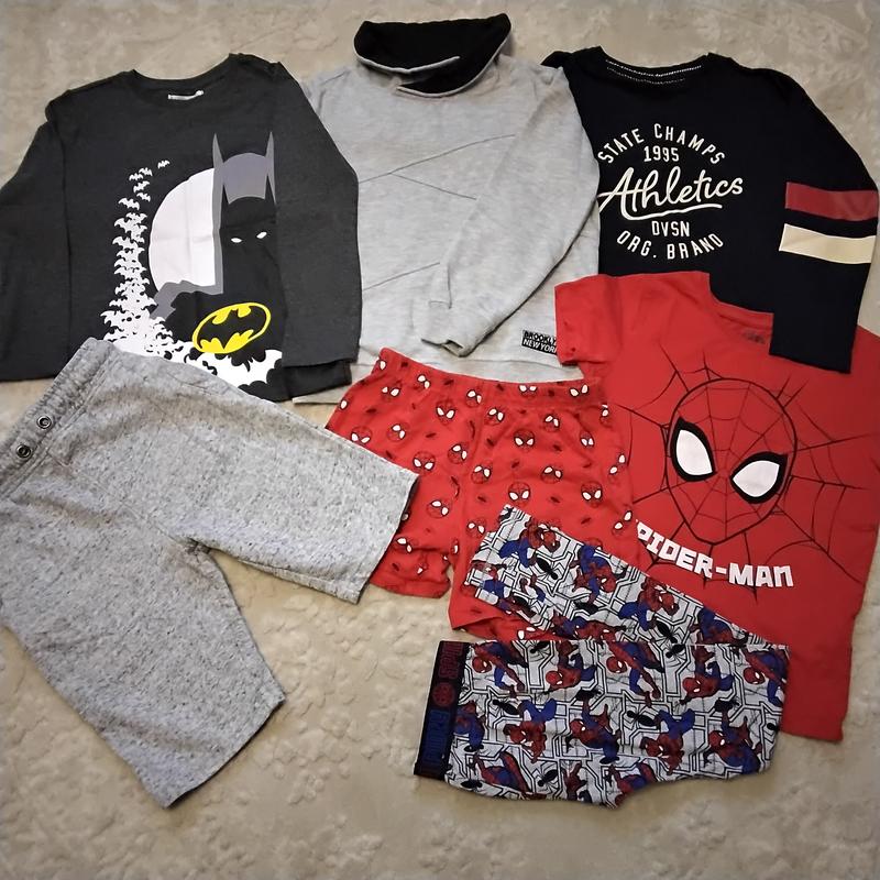 1.Серая кофта п/об.-40см, рукав-42см, длиж.-44см 2.Кофта синя Reserved п/об.-38см,рукав-35см,довж.-48см 3.Серая кофта Batman п/об.-35см, рукав-42см, длинн.-46см 4.Штаны пижамные новые Spiderman п/об.-25см,длин.-62см 5.Шорты серые п/об 29см 6.Пижама Spiderman на 128см Все в отличном состоянии.