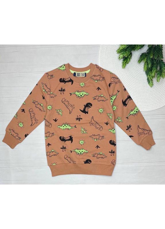 Стильный свитшот. Его можно комбинировать с различными вещами. Продуманный крой позволит двигаться свободно и естественно. Выполнен из натурального приятного к телу материала. Характеристики Цвет - коричневый Сезон Демисезонный Декор Принт динозаври Склад 95%-бавовна; 5%-лайкра