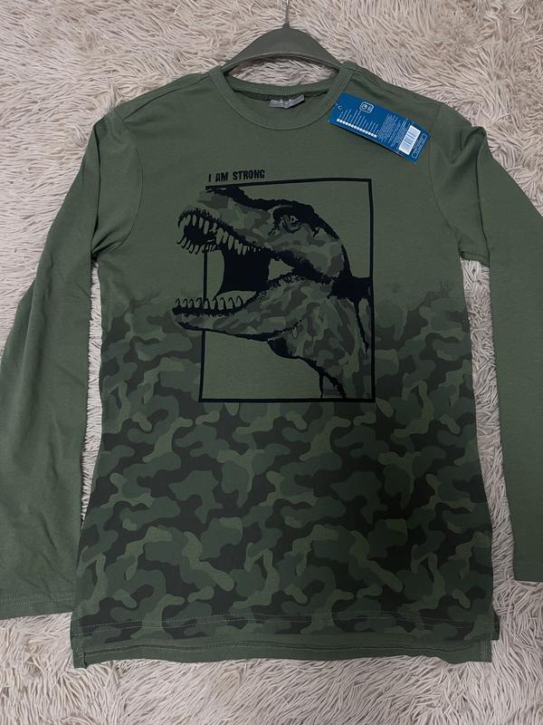 Лонгслив на парня, новый. Цвет хаки с принтом, тоненький трикотаж. Размер 146-152.