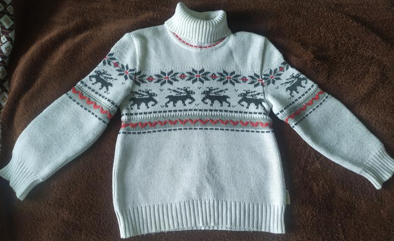Продам праздничный свитер с оленями на ребенка. Рост указан 122. Замеры: плечи - 35 довж.рукава - 45 довж.светру - 49 ширина светру - 36