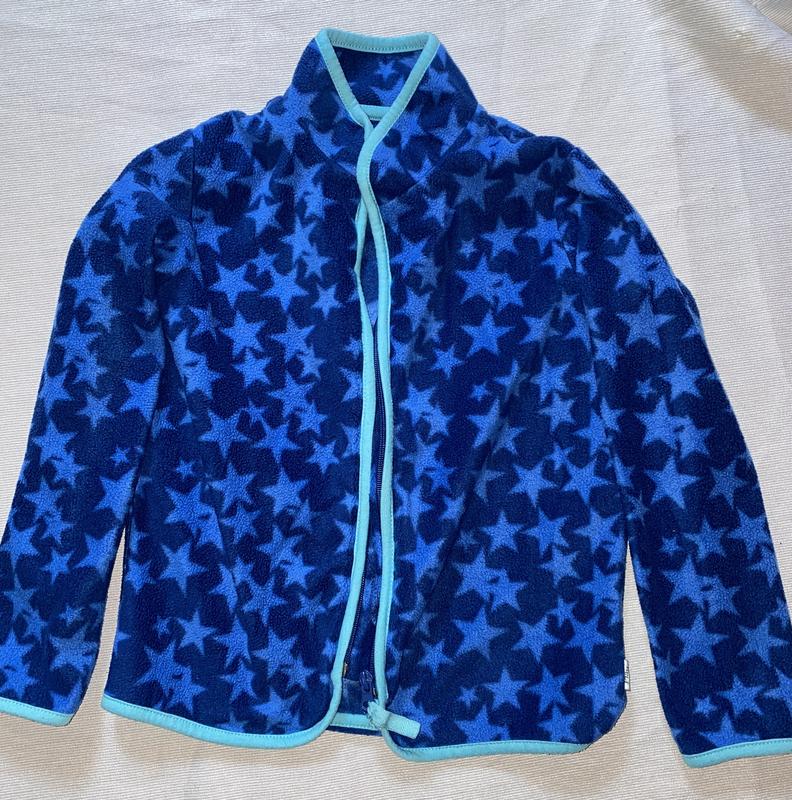 Флісова кофта з зірочками: довжина від плеча 49, ширина 39, плечі 30, рукав від плеча 46, від коміра 56. Ньюанс на останньому фото, маленькі плямки на внутрішній стороні рукава, в іншому стан чудовий. Ціна 100 грн. Синя кофта: довжина 49, ширина 36, плечі 28, рукав від плеча 44, від коміра 49,5. Є сліди носіння, тому ціна 50 грн