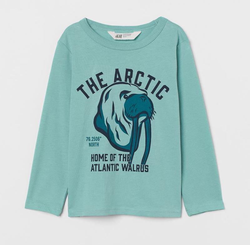 Детская кофта лонгслив на мальчика. Лонгслив с длинным рукавом из мягкого хлопкового трикотажа с набивным рисунком. Рельефная трикотажная резинка по горловине. H&M 4-6 лет - р.110-116: рукав от плеча 38, длина 44, ПО груди 33