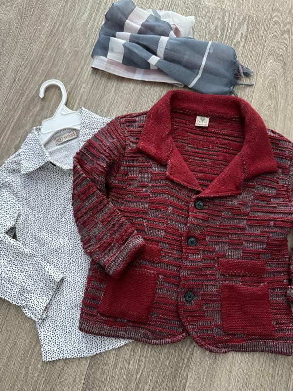 Фабричная дорогая Турция Комплект Рубашка с длинным рукавом +кофта с длинным рукавом очень теплая,заменит ветровку+шарфик двухцветный TOYSI Размер указан 104 Отлично на 3-5 лет Рубашка -плечи 26+рукав с манжетом от плеча 33-34, Кофта -плечи 32+рукав полная длина 38- и подворачиваете как нужно Новый комплект, так и не одели- переросли