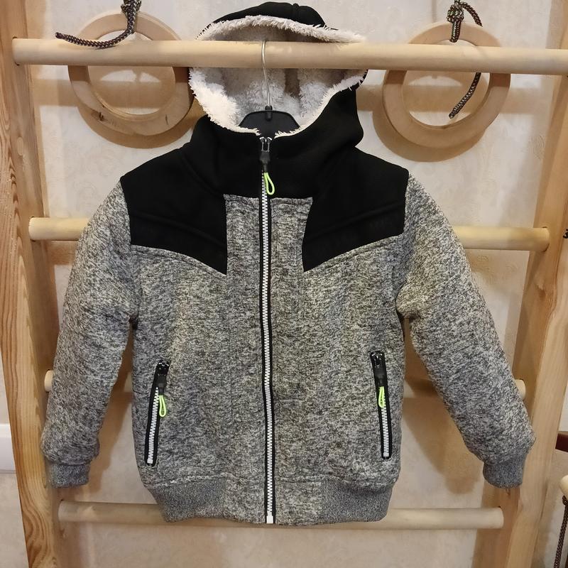 Теплая кофта на меху для мальчика на рост 110см. Рукава утеплены тонким наполнителем но без меха. Есть рабочие карманы. Стан идеален, успели надеть несколько раз. длина по спинке от капюшона 45см, длина рукава от плеча с манжетом 40см, плечи 33см, расстояния между подмышками 40см.