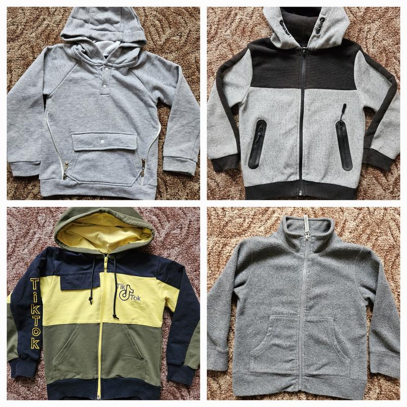 1. Серая кофта (кингуру) состояния новой (одеяла несколько раз, очень стильно смотрится - 170 грн. 2. Кофта серая с черным, в идеальном состоянии, ткань плотная, карманы, замки рабочие - 150 грн. 3. Кофта (черная/желтая/хаки) в идеальном состоянии, стильно смотрится, чуточку тоньше кофта серой с черным. карманы, замки рабочие - 150 грн. 4. Серая флиска, очень теплая, практичная в прохладные дни. в идеальном состоянии, карманы, замки рабочие - 180 грн. Все вещи без нюансов, замеры задам по запросу. Благодаря манжетам вещи идеально подойдут на рост 104 (с запасом) до 116.