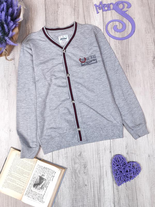 Новая кофта для мальчика Soow серого цвета. V-образный вырез горловины, имитация застежки на пуговицы. Состояние новое Производитель Soow Страна производитель Турция Размер: 152 (12 лет) Цвет серый Состав 100% хлопок Замеры полуобхват груди 41 см, полуобхват талии 41 см, длина рукава 55 см, ширина по плечам 38 см, длина 58 см