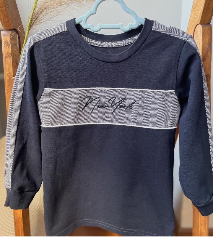 Красивый темно синий лонгслив с надписью😍 По наборке 4-5 лет. Замеры: длина изделия 46 см, длина рукава 34 см. Состояние нового, без бумажной бирки.