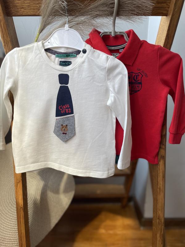 Комплект из 2 единиц. Крутой красный лонгслив с воротником и объемными надписями. Фирмы Original Marines по бирке 9-12 месяцев (см). Замеры: длина изделия 32 см, длина рукава 27 см. Состояние новое с бумажной биркой. Красивый белый лонгслив с нашитым галстуком 😍. Фирмы Original Marines по бирке 9-12 месяцев (см). Замеры: длина изделия 33 см, длина рукава 28 см. Состояние новое с бумажной биркой.