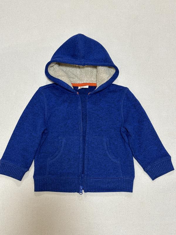 Кофта с утепленным капюшоном тканью Тедди. Состояние отлично, потому что в таком возрасте трудно испортить вещи. Дети быстро растут) Замеры: Длина спинки - 37 Ширина по комди - 34 Ширина плечей - 29 Длина рукава - 31