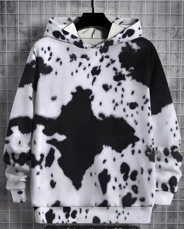 "Кофта с капюшоном с 3D рисунком коровы, изготовлена из смесового полиэстера. Повседневный стиль, длинный рукав, слегка эластичная ткань. Черно-белый случайный узор, подходит для весны и осени. Подходит для детей до 12 лет."