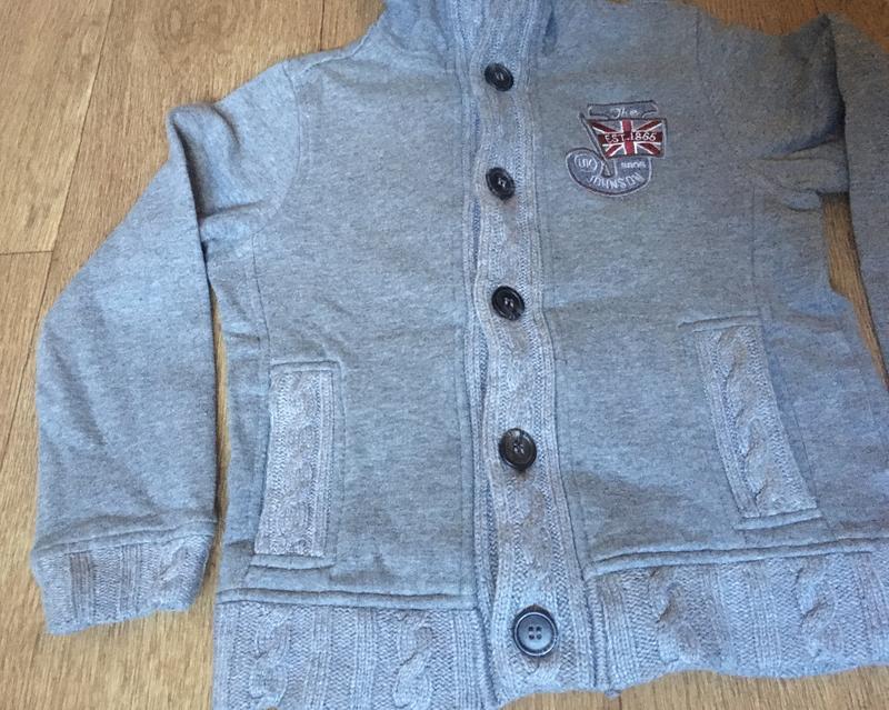 Кофта, кардиган утеплённый на флисе, с трикотажными декоративными вставками. Есть карманы, капюшон, на пуговицах.