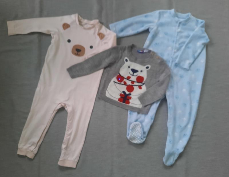 Продам набор одежды на размер 86-92. Для ценителей медвежат)) Джемпер Lupilu с зимней тематикой, светятся слои от прикосновения. Человечек 100% хлопок с мишкой на груди. Застегивается на кнопках по внутренней поверхности ножек, состояние новой вещи. Флисовый голубой человечек с медвежонками, ножки закрытые. Состояние отличное. Замеры задавайте вопросы.