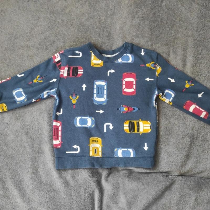 кофта фирмы H&M. На бирке размер 104, но маломерит как на 98. В нормальном состоянии. Тканина трьохнитка Замеры: рукав 31.5 см длина 39 см ширина 33 см цвет синий с цветными машинками. рукав на манжете