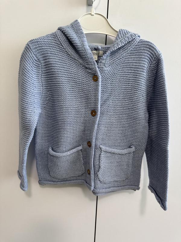 Вязаная кофта на мальчика нежного голубого цвета на Гудзиках есть карман с капюшоном Новый возраст указан на 2 года В жизни выглядит более нежный цвет и насыщеннее Дополнительные фото видео или замеры надеваю